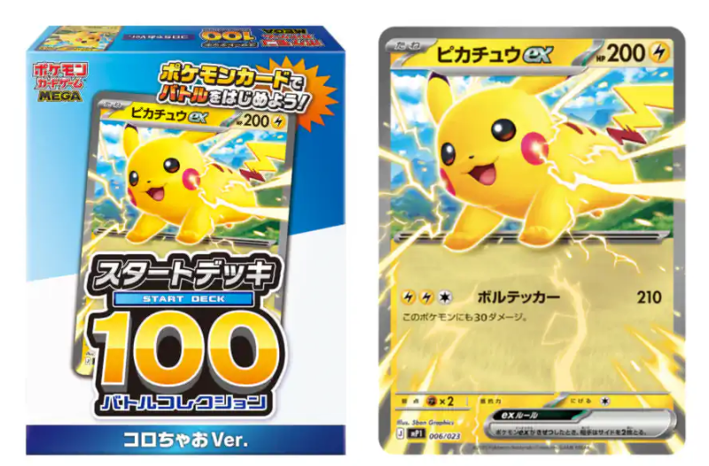 事實上,「スタートデッキ100 バトルコレクション」本身就是一個極具話題性的系列。官方設定為共有 100 種不同構築的牌組,採隨機封入形式,每一副牌組的收錄寶可夢、戰術思路與對戰風格都不盡相同,讓玩家在開封時充滿未知與期待。而這次隨《コロちゃお》推出的版本,則被官方定位為第 101 副的特別存在,不僅擁有獨立於市售商品之外的版本名稱,更以專屬插畫的皮卡丘ex作為核心,兼具收藏價值與實戰意義。