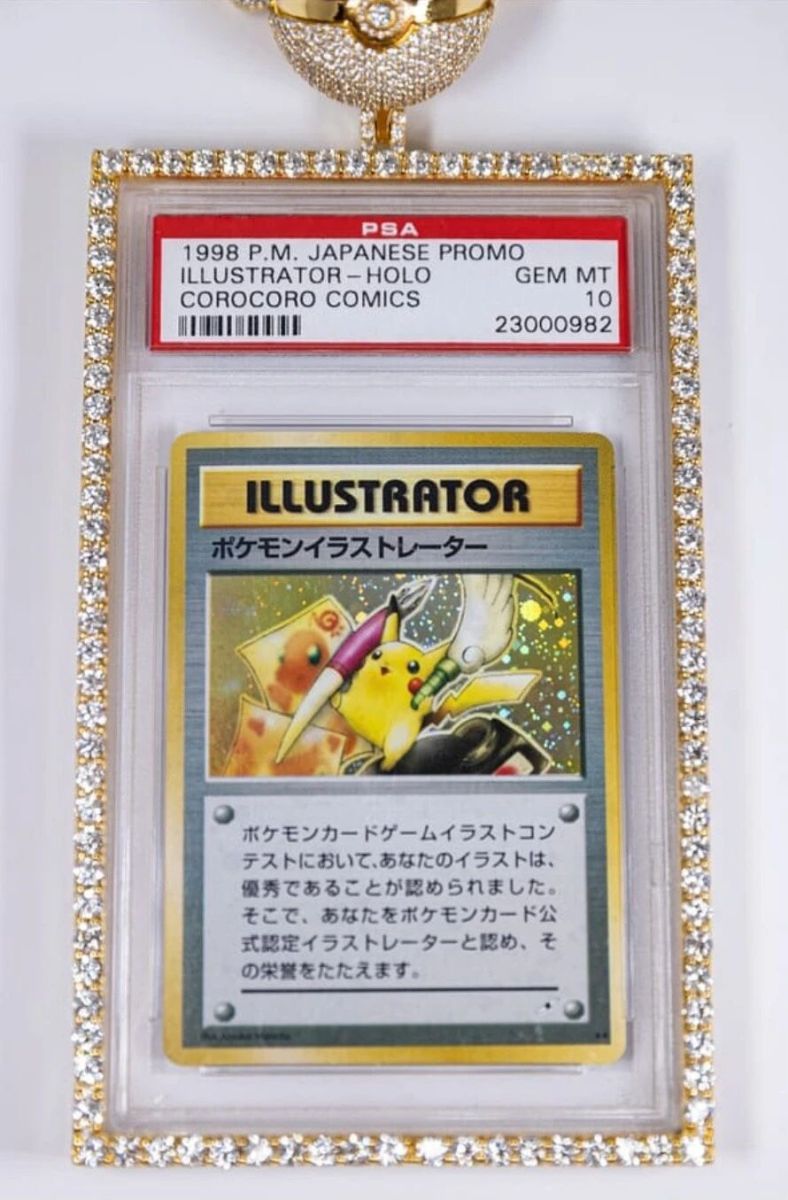 In terms of rarity and condition, this Pikachu Illustrator card is the only example in the PSA population to have received a GEM MT 10 grade, bearing certification number 23000982. Other grading companies, such as Beckett, have awarded a maximum of only 9 to comparable cards, further underscoring the unmatched condition and significance of Paul’s copy. The accompanying necklace is itself a work of art, crafted by renowned jeweler Suny Jewelry and set with approximately 35 carats of VVS1-grade natural diamonds—numbering in the tens of thousands—paired with a 10-carat Italian pure gold chain. The set also includes a custom wooden display box engraved with “1 of 1,” emphasizing its one-of-a-kind status.