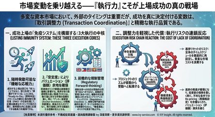 激動する資本市場において、多くの企業は「外部環境」を重視しがちですが、真の成否を分けるのは「ディール・コーディネーション能力(取引調整力)」です。市場の好機(ウィンドウ)が短命化する中、上場を成功に導くのは、内部の精緻な執行によって不確実性を最小限に抑える力に他なりません。1. 上場成功のための「免疫システム」:3つの執行核心卓越したコーディネーションは、単なるプロセス管理ではなく、プロフェッショナルな予見に基づく系統的な支えです。即座に始動できる「アジリティ(俊敏性)」:成功する上場は好機を「待つ」のではなく、常に「準備を整えて待つ」ものです。"Ready-to-file"(即時提出可能)な体制と専任のPMO設置により、一瞬の市場ウィンドウが開いた際に、即座に対応できる動員力を確保します。「安定性」によるバリュエーションの最大化:投資家のリスク認知は、直接価格に反映されます。規律あるプロセスは執行への信頼を生み、特にアンカー投資家の戦略的確保は、資金面のみならず、発行価格の妥当性を支える強力な証拠となります。先制的な規制対応管理 (Regulatory Forward-thinking):規制当局との対話は「受動的」であってはなりません。クロスボーダーな規制要件リストを管理し、一貫した論理を維持することで、審査の遅延というリスクを根源から遮断します。2. コーディネーション欠如の代償:執行リスクの連鎖ファンダメンタルズが盤石であっても、調整力が欠如すれば以下の泥沼に陥ります。スケジュールの白紙化: 書類の些細な不備が、全体のタイムラインをリセットさせ、膨大なコスト増を招きます。規制当局との対話の断絶: コミュニケーションの乖離は、不要な「追加質問」を誘発し、プロジェクトの主導権を奪われます。価値の毀損と再プライシング: 停滞は投資家の熱意を奪い、最終的には不利な条件での再プライシング(下方修正)を余儀なくされ、バリュエーションを損なわせます。