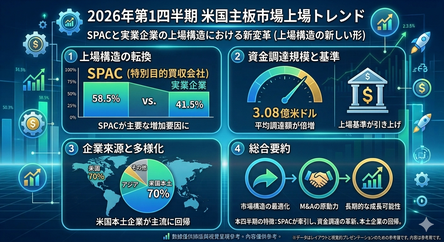 2026年Q1 米国メインボード市場上場トレンド報告今四半期の米国資本市場は、実業企業の減少、資金調達ハードルの上昇、国内企業の回帰という顕著な構造的変化を見せました。主な5つの観測ポイントは以下の通りです:1. 上場構造:SPACが逆風の中で主力に今四半期に新規上場した企業は計 106社 ですが、その構造は劇変しました。実業企業: わずか 44社、比率は 41.5% に急落(2025年Q1の 78% からほぼ半減)。SPAC(特別目的買収会社): 今四半期の上場増加における中核的な源泉となりました。2. 資金調達規模:基準が大幅上昇、少額IPOの消滅実業企業の数は減少したものの、「質」と「規模」が明確に連動しています。平均調達額: 3.08億ドル に達し、前年同期(1.45億ドル)比で倍増。少額調達の縮小: 1,500万ドル未満のIPOはわずか3社にとどまり、低ハードルな資金調達時代の終焉を示唆しています。3. 上場チャネルと取引所の動向チャネル分布: 従来型IPO が66%を占め依然として主流ですが、DPO(直接上場) が今四半期は7社に達し、顕著に熱を帯びています。取引所の選択: ナスダック(Nasdaq)とニューヨーク証券取引所(NYSE)の勢いが均衡し、比率は約 55% vs. 45% となりました。これまでのナスダック一強状態が打破されています。4. 企業ソース:米国国内企業の回帰とアジア市場の冷え込み実業企業の出身地構成に「断崖絶壁」のような変化が起きました。米国国内: 比率が 70% に達し、市場の主導権を奪還。アジア企業: わずか 2社(香港・日本から各1社)にとどまり、比率は 5%未満。比較:2025年通期ではアジア企業が全体の42%を占めていました。5. 市場劇変の2大要因調達基準の引き上げ: ナスダックとNYSEが足並みを揃え、最低IPO調達額を 1,500万ドル に引き上げたことで、多くの中小規模のアジア企業が断念を余儀なくされました。規制と審査の厳格化: 米証券取引委員会(SEC)が2025年末より市場操縦の疑いがある企業に対し強力な取引停止措置を講じたことで、アジア企業に対する審査が極めて厳しくなっています。
