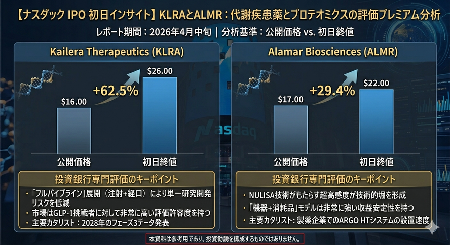 昨日確認されたこれら2銘柄のパフォーマンスは、2026年上半期における米国バイオテック市場の投資ロジックを象徴しています。KLRAの大幅な上昇は「ブロックバスター」級の新薬創出ポテンシャルへの追随を反映し、ALMRの安定したプレミアムは「精密診断ツール」の確実性に対する評価を示しています。投資家の関心は、単なるストーリー主導の投機から、臨床での実装能力や商業的なキャッシュフロー創出力を備えた資産へとシフトしています。