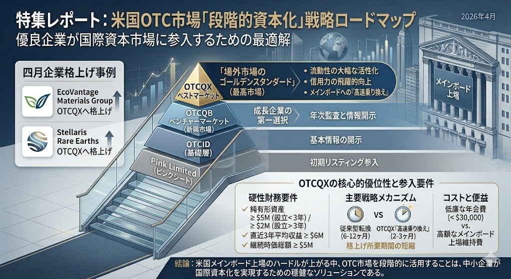 2026年4月、米国資本市場は「内実を伴った」クオリティの飛躍を遂げました。従来の盲目的なメインボード上場志向とは異なり、直近では持続可能な資源や戦略的鉱物資源に特化した EcoVantage Materials Group や Stellaris Rare Earths といった優良企業数社が、Pink Limited や OTCID(基礎層)から、OTC市場の最上位セグメントである OTCQX Best Market への昇格を果たしました。