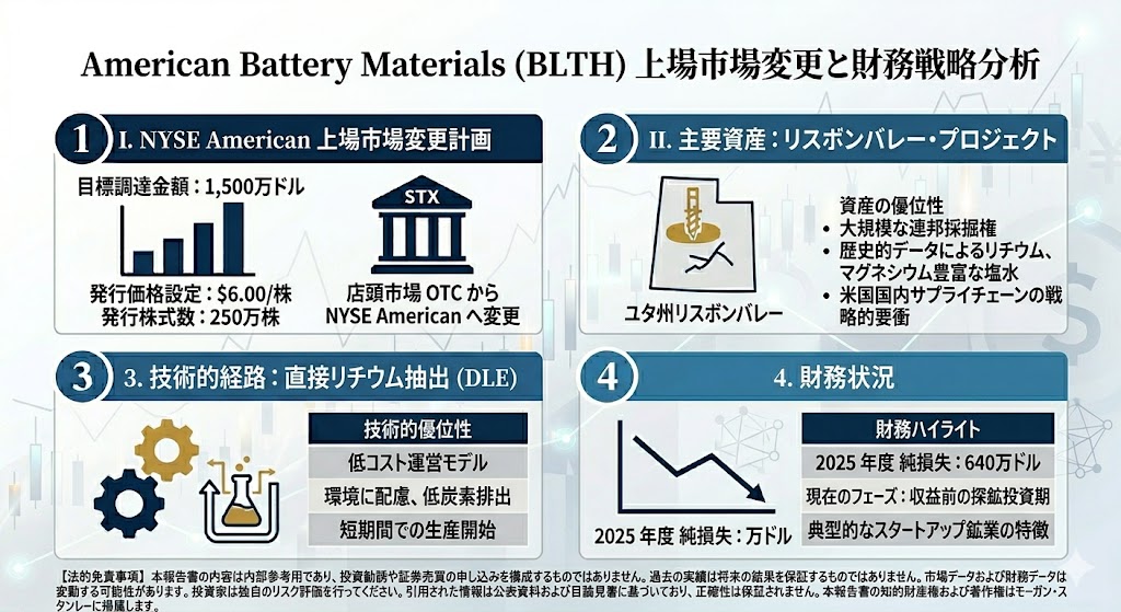 NYSE American への上場市場変更は、ABMの資本戦略における重大な転換点となります。これはBLTHの取引流動性を大幅に向上させるだけでなく、クリーンエネルギー・サプライチェーンに特化した機関投資家を惹きつける一助となるでしょう。資金調達の完了後、潜在的な資源を規制基準に準拠した「証明済み埋蔵量」へと転換できるかどうかが、今後の市場評価額(バリュエーション)を決定付ける鍵となります。