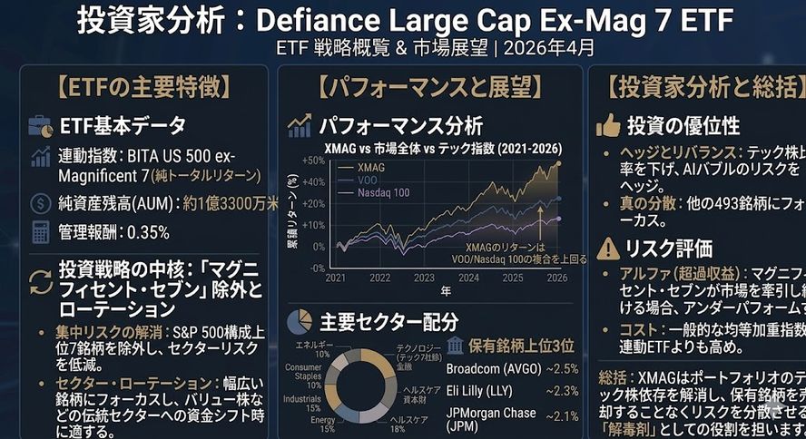 Defianceが提供するXMAG(Defiance Large Cap Ex-Mag 7 ETF)は、近年の米国株式市場における「指数集中リスク」に対応するために誕生した革新的な投資ツールです。その運用ロジックは非常にシンプルであり、S&P 500指数構成銘柄から、極めて強い影響力を持つ「マグニフィセント・セブン(Mag 7)」を除いた残りの銘柄に投資します。