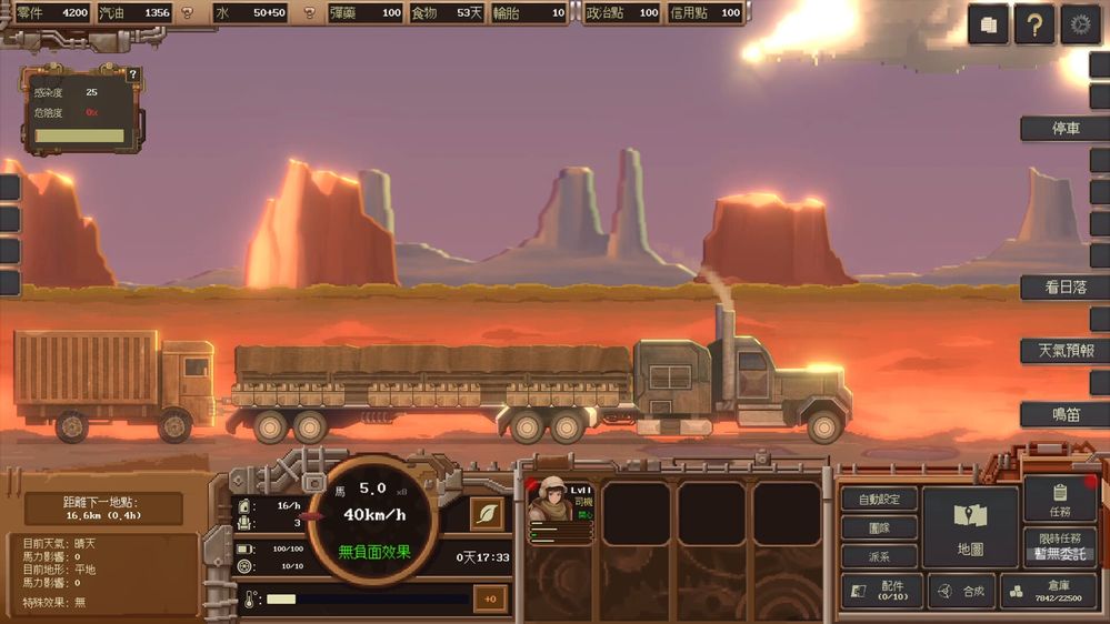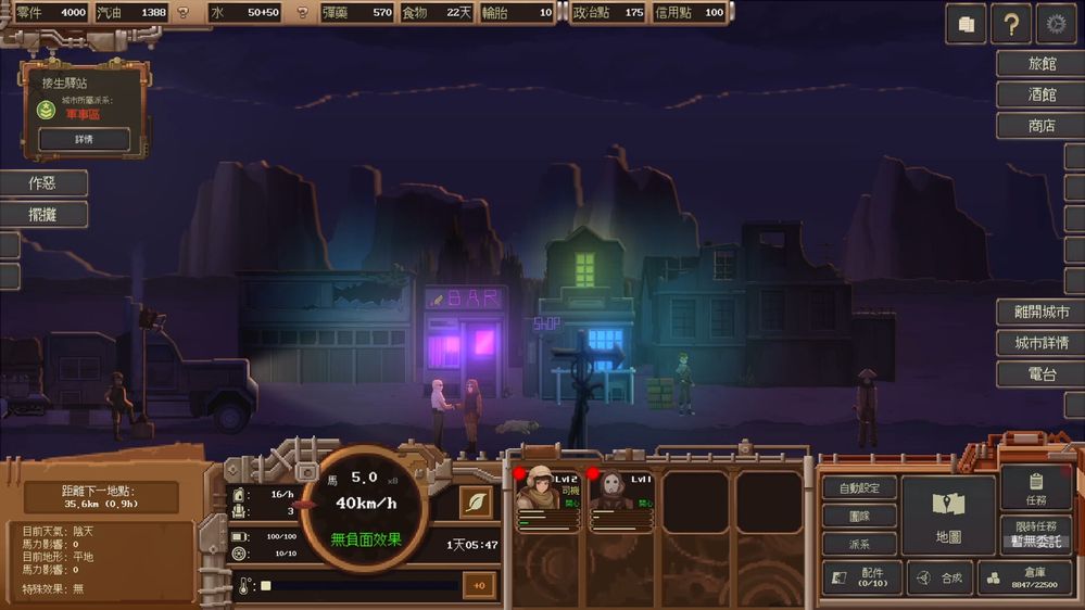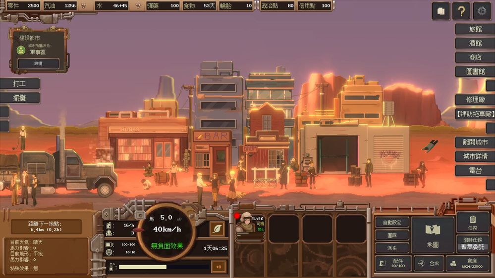 經營層面則是遊戲的重要核心。可以修繕並擴建自己的城市,調控資源流向,建立穩定的貿易路線,逐步將基地發展成廢土中的核心都市。不同聚落有各自的需求與特色,如何在買賣差價中獲利,並在風險與報酬之間取得平衡,是遊戲策略深度的來源之一。此外,設有大量隨機事件與天氣系統,例如不死族襲擊、武裝車隊出沒、神秘訊號出現,或是突如其來的沙暴與惡劣環境,都會迫使玩家臨場應變,讓每一次旅程都充滿不確定性與緊張感。