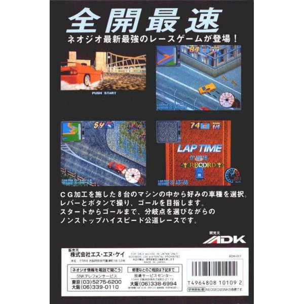 Released in 1996 on the Neo Geo arcade system (MVS) and later ported to AES and CD home consoles, Over Top / オーバートップ is a top-down racing game developed by ADK and published by SNK. As the spiritual successor to ADK’s earlier title Thrash Rally, this game emerged during the mid-90s, a period when racing games were increasingly shifting toward 3D. Instead of following the trend, Over Top honed its 2D presentation to perfection, combining meticulously pre-rendered graphics with unique long-distance track design, making it one of the most distinguished racing titles on the Neo Geo platform.