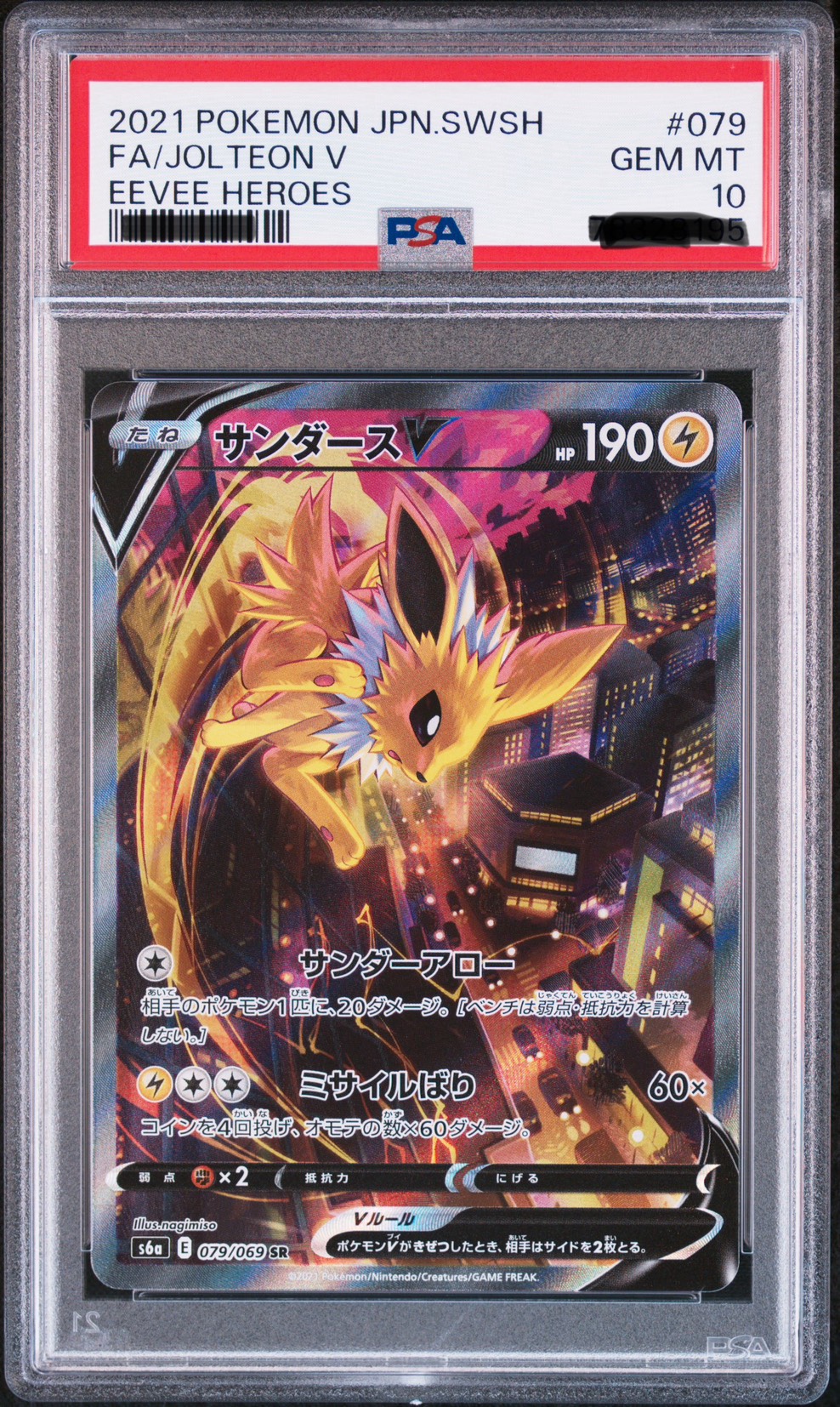 As of 2026, PSA 10 graded copies of Jolteon V SA remain actively traded with relatively stable pricing. Ungraded near-mint copies typically range from approximately 25,000 to 35,000 yen, while PSA 10 examples generally trade between 55,000 and 75,000 yen. Compared to the speculative peak period around 2023, the market has since stabilized, but rather than collapsing, prices have gradually consolidated and shown mild upward resilience.