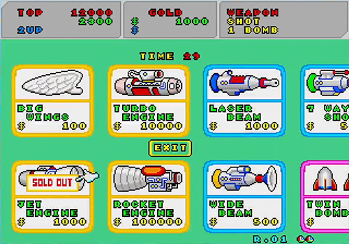 Enemies and bases drop coins of various sizes and values, which serve as the game’s currency. These coins are used at the shop balloons that occasionally appear, allowing players to purchase speed upgrades, weapon enhancements, bomb types, and even extra lives. This “money-based power-up system” adds considerable depth to the strategy, as every death is costly—any equipment Opa-Opa has purchased is lost immediately upon being defeated.