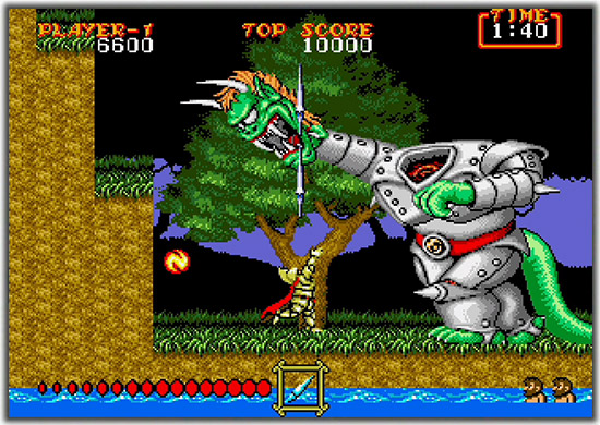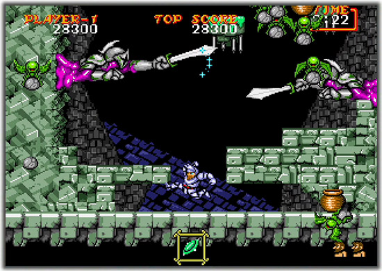 在無鎧甲的裸體狀態下,亞瑟變成動作緩慢的老人,也影響到射擊速度,等約移動半個畫面的時間後就會恢復正常。