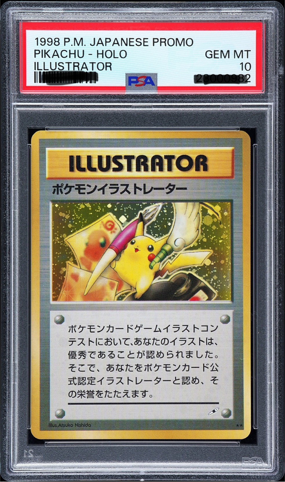 Unlike standard Pokémon cards, the title printed on the card reads “Illustrator” instead of the usual “Trainer,” symbolizing its direct connection to artistic creation. The artwork was drawn by renowned Pokémon designer Atsuko Nishida, often called the “mother of Pikachu,” giving the card both historical and artistic significance. This direct link to one of the franchise’s original creators grants the card a level of authenticity and cultural importance similar to an original artwork in the traditional art market.