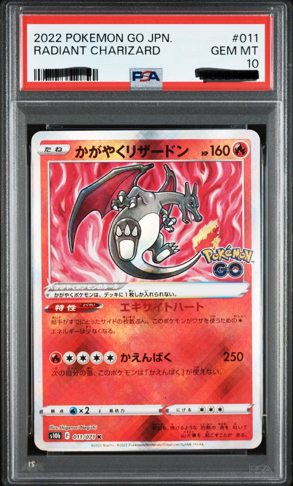 在市場價格方面,截至2026年,PSA 10 評級的輝耀噴火龍大致落在 12,000 至 16,000 日圓區間,折合約 新台幣 2,500 至 3,500 元左右,會隨匯率與市場需求波動。整體而言,這張卡的評級難度偏低,主要原因在於其發行量相對較大,加上卡牌本身採用較厚紙材與穩定印刷品質,使得達到 PSA 10 的比例明顯高於許多早期卡牌。