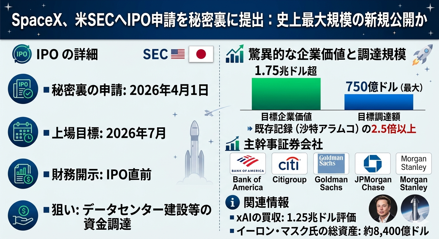 【最新ニュース】スペースX、SECにIPO申請書類を非公開で提出 ─ 史上最大の新規上場へイーロン・マスク氏率いる宇宙開発企業スペースX(SpaceX)が、米証券取引委員会(SEC)に対し、新規株式公開(IPO)に向けた登録届出書草案を非公開で提出したことが明らかになりました。上場スケジュールとプロセス関係者によると、同社は2026年7月までの上場を目指しており、これはマスク氏が以前示唆していた目標と一致します。「非公開提出(Confidential Filing)」制度を利用することで、財務詳細の一般公開を遅らせつつ、SECと開示内容に関する事前協議を進めることが可能となります。記録的な企業評価額と資金調達規模想定時価総額:1兆7,500億ドル(約260兆円)超を見込んでいます。資金調達額:最大で750億ドルに達する可能性があり、実現すれば2019年のサウジアラムコ(290億ドル)を大幅に塗り替え、世界史上最大のIPOとなる見通しです。主幹事証券会社と直近の動向主幹事団:バンク・オブ・アメリカ、シティグループ、ゴールドマン・サックス、JPモルガン・チェース、モルガン・スタンレーの5行が指名されました。AI事業の統合:スペースXは先に、同じくマスク氏が手掛けるAIスタートアップ「xAI」を企業価値1兆2,500億ドルの条件で買収・統合しており、宇宙事業とAIのシナジーを強調しています。戦略的意義これまでマスク氏は「火星移住の目途が立つまで上場しない」としていましたが、軌道上でのAIデータセンター建設などの新戦略に向けた巨額の資本投下に舵を切った模様です。上場が成功すれば、マスク氏は「2つの1兆ドル規模の上場企業」を同時に率いる初の経営者となり、その資産推計は8,400億ドルに達すると予測されています。