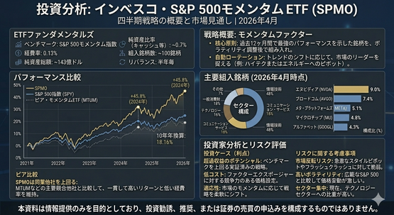 メリット:強固なパフォーマンス: S&P 500指数のリターンに満足できない投資家にとって、「超過収益(アルファ)」を獲得するための強力なツールとなります。低コスト: わずか0.13%の経費率で、専門的なモメンタム戦略を享受できます。柔軟性: 特定のセクターに固執せず、市場トレンドの変化に応じてポートフォリオが進化します。