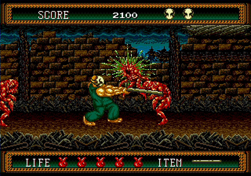 Though the number of weapons is limited, each has distinct personality. Iron clubs and giant bones deliver heavy blunt force; scissors and chainsaws initially attack Rick but can be taken and used against foes; the shotgun deals overwhelming damage and can kill most enemies instantly, yet appears only once in the entire game; chemical bottles work especially well on particular monsters; and in some stages, Rick can rip off an enemy’s head to use as a weapon, or swat creatures aside with an oar while crossing the lake. Combined, these weapons form a visceral and violent aesthetic, pushing the Mega Drive hardware to its limits. The game systems include difficulty adjustments, changes to maximum health, recovery mechanics after clearing stages, and a password feature exclusive to overseas versions. Despite its simple controls, the varied enemy types and trap layouts maintain constant tension and challenge.