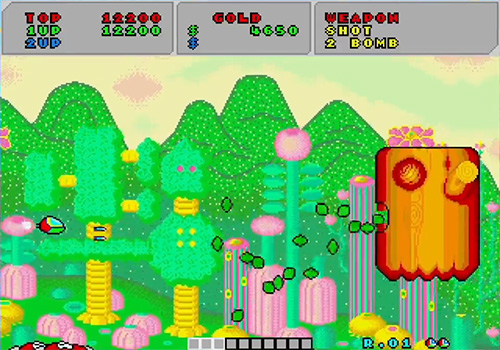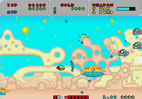 Enemies and bases drop coins of various sizes and values, which serve as the game’s currency. These coins are used at the shop balloons that occasionally appear, allowing players to purchase speed upgrades, weapon enhancements, bomb types, and even extra lives. This “money-based power-up system” adds considerable depth to the strategy, as every death is costly—any equipment Opa-Opa has purchased is lost immediately upon being defeated.