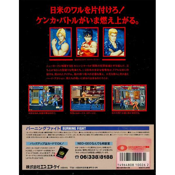 1991年在Neo Geo街機基板(MVS)正式亮相,並隨後移植至家用主機(AES 與 CD)的《熱血快打》(Burning Fight / バーニングファイト),是由SNK 為切入當時由Final Fight所帶動的橫向捲軸清版動作熱潮而推出的重要作品。在Neo Geo發展初期,以濃厚的街頭電影風格與硬派暴力美學,成功塑造出一個充滿危險氣息的都市舞台,試圖在霓虹閃爍的虛構大阪街頭中,呈現一場節奏緊湊且拳拳到肉的掃黑行動。