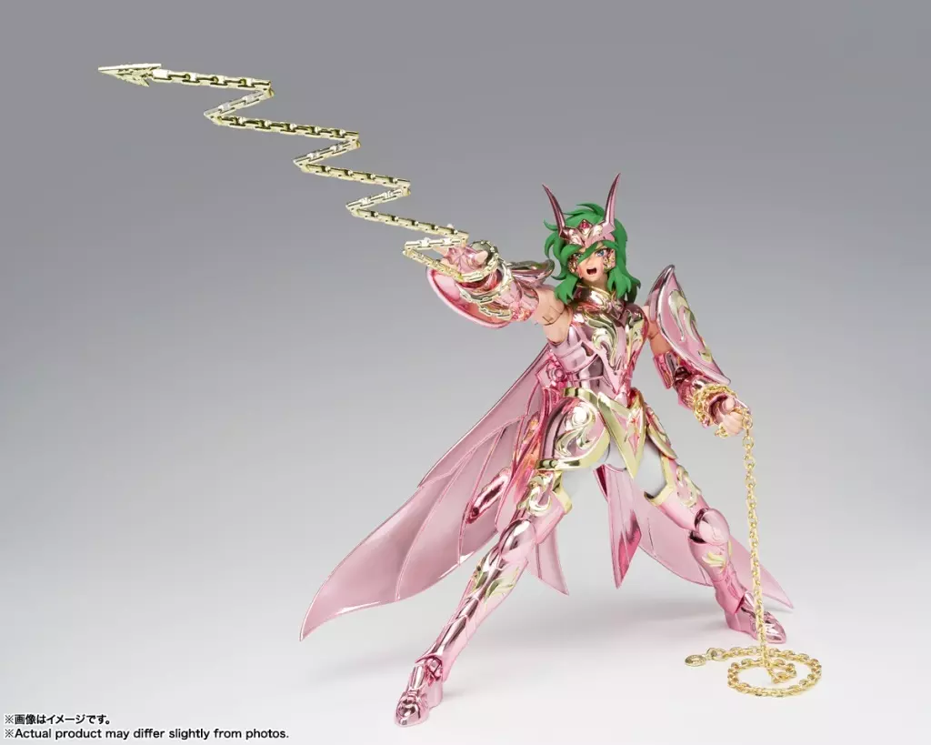 人物設定上,仙女座瞬是鳳凰座一輝的弟弟,以溫柔善良著稱,是五位青銅聖鬥士中最具慈悲心的戰士。他擁有白皙的膚色、柔順的綠髮與粉紅聖衣,雖然外表看似柔弱,但在危急時刻總能喚醒體內的強大力量。其絕技「星雲鎖鏈」兼具攻防特性,而神聖衣形態的瞬更能發揮出無比的防禦力與聖力光輝,是象徵“以慈悲為力量”的代表角色。模型高約17公分,材質由ABS、PVC及金屬壓鑄(Die-cast)組成,兼具重量感與高級質感。神衣的金屬部件不僅提升了實體手感,也讓整體結構更為穩固,無論展示或把玩都十分出色。