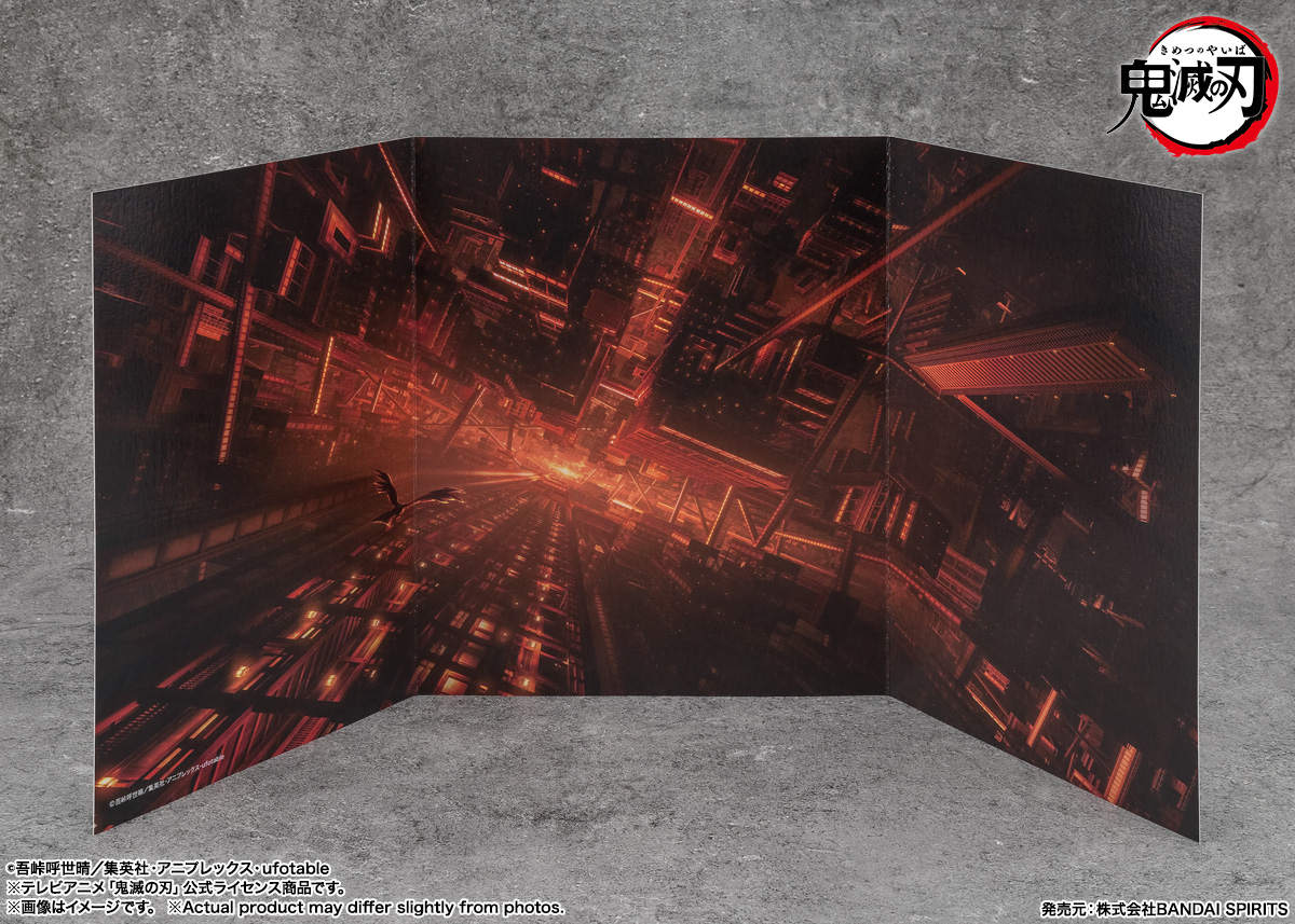 模型全高約 140mm,使用 PVC 與 ABS 製作,體態比例與動畫風格十分接近。隨附的日輪刀具有金屬質感,刀鞘與刀柄紋路也經過精細刻畫。替換手首的種類使各種施招或持刀姿勢都有極高的可玩性,而最具話題性的附屬物則是特別收錄的無限城篇官方視覺背景,可直接放在展示架後方,將整體呈現強化為充滿壓迫與沉浸感的決戰舞台。