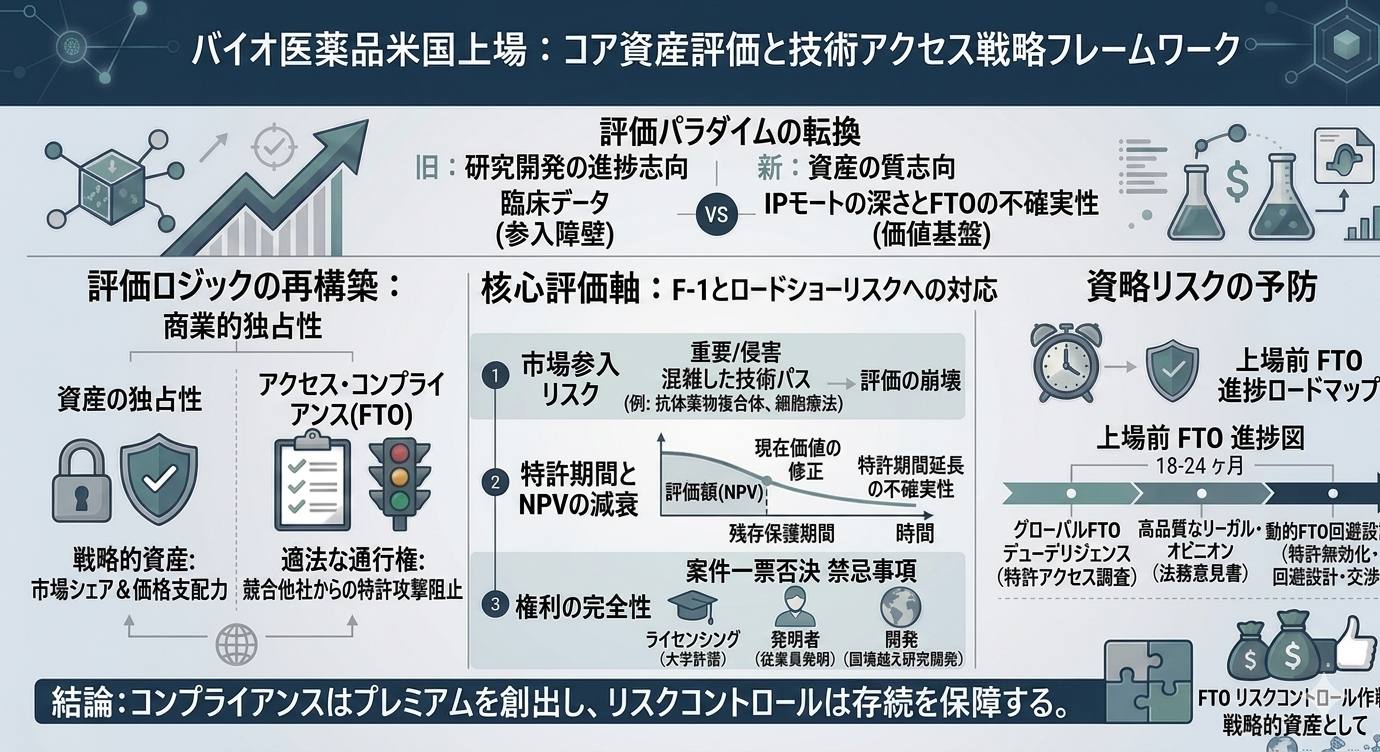 現在のNASDAQバイオテクノロジーセクターにおいて、投資判断基準は「研究開発進捗(R&D Progress)」から「資産の質(Asset Quality)」へと構造的に変化しています。投資家にとって臨床データはあくまで「前提」であり、知的財産(IP)の強固さとFTO(自由実施分析)の確実性こそが、長期的な企業価値とリスク耐性を決定する真の基石です。