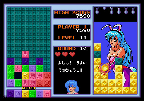 The game offers several modes, each with its own appeal. Exercise mode functions as a single-player challenge course in which players progress by fulfilling mission objectives displayed on the right side of the screen—such as reaching a target score or clearing a certain number of panels of a specific color. There are thirty stages in total, and players may choose from four different starting “Lessons,” each beginning at a later point in the course for those who want a tougher challenge right away. Pin-up mode, the most talked-about element of the game, features an illustration on the right side that is concealed by blocks. Clearing panels causes bomb markers to drop, breaking corresponding tiles that cover the artwork. Clearing four or more blocks at once produces multiple bombs, allowing large portions of the image to be revealed at once. The cover tiles come in two types: yellow, which break with a single bomb, and green, which require two hits. Every five stages correspond to one character and reveal four progressively detailed illustrations. Although the game features ten characters in total, each playthrough only displays five of them—the first and last are fixed, while the other three are chosen at random—giving the mode a built-in incentive for repeated runs. Players are given multiple lives, losing one whenever the field rises to the top, and earning extras with every ten thousand points, creating a balance between arcade-like tension and collection-driven motivation.