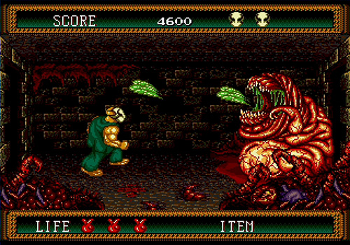 Though the number of weapons is limited, each has distinct personality. Iron clubs and giant bones deliver heavy blunt force; scissors and chainsaws initially attack Rick but can be taken and used against foes; the shotgun deals overwhelming damage and can kill most enemies instantly, yet appears only once in the entire game; chemical bottles work especially well on particular monsters; and in some stages, Rick can rip off an enemy’s head to use as a weapon, or swat creatures aside with an oar while crossing the lake. Combined, these weapons form a visceral and violent aesthetic, pushing the Mega Drive hardware to its limits. The game systems include difficulty adjustments, changes to maximum health, recovery mechanics after clearing stages, and a password feature exclusive to overseas versions. Despite its simple controls, the varied enemy types and trap layouts maintain constant tension and challenge.